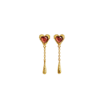 Flotte øreringe formet som et hjerte med pink granat og en gylden element hængende ned derfra.