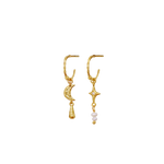 Smukke halv creoler med bølgende detaljer, hvor der hænger halvmåne, harlekinform, ferskvandsperler og en flot dråbe ned fra.