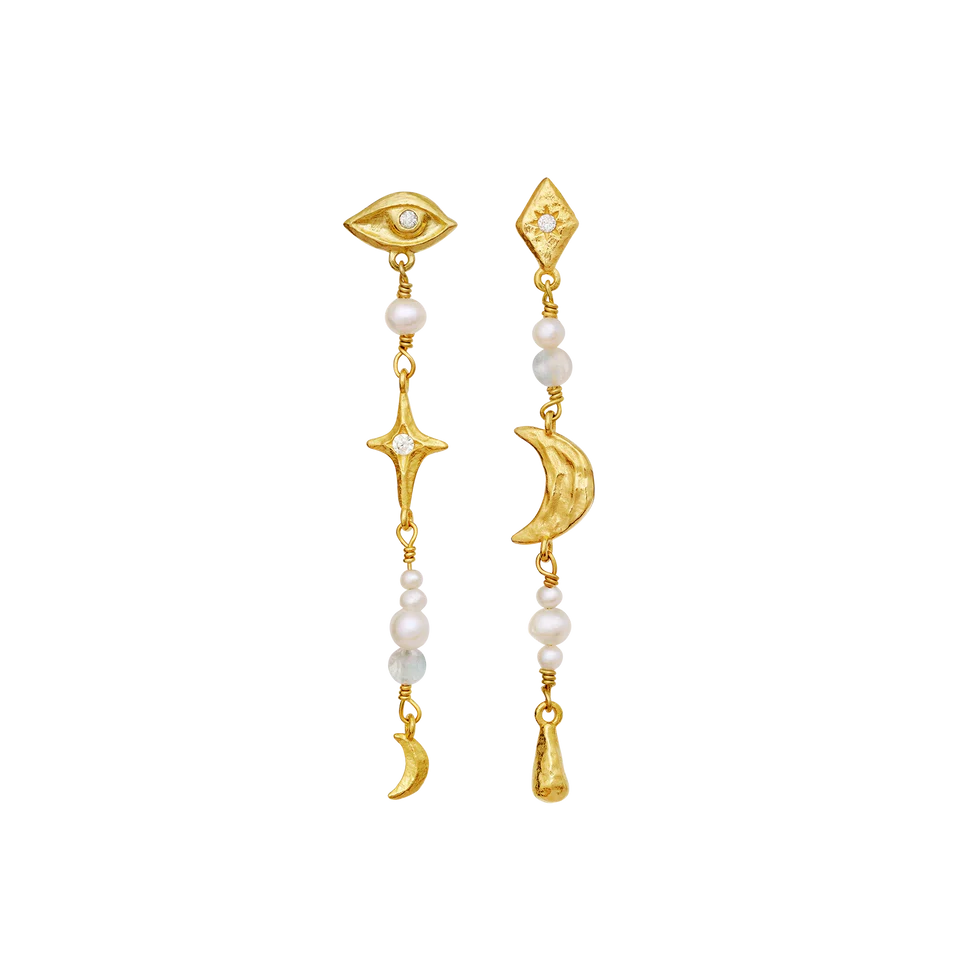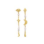 Flotte øreringe der hænger med mange symboler, ferskvandsperler og zirkoner. De er asymmetriske hvor den ene er med harlekinform, halvmåne og ferskvandsperler. Den anden med Horus øje, stjerne og ferskvandsperler. Rigtige øreringe med teaterets dramatiske univers med mange kunstneriske detaljer.