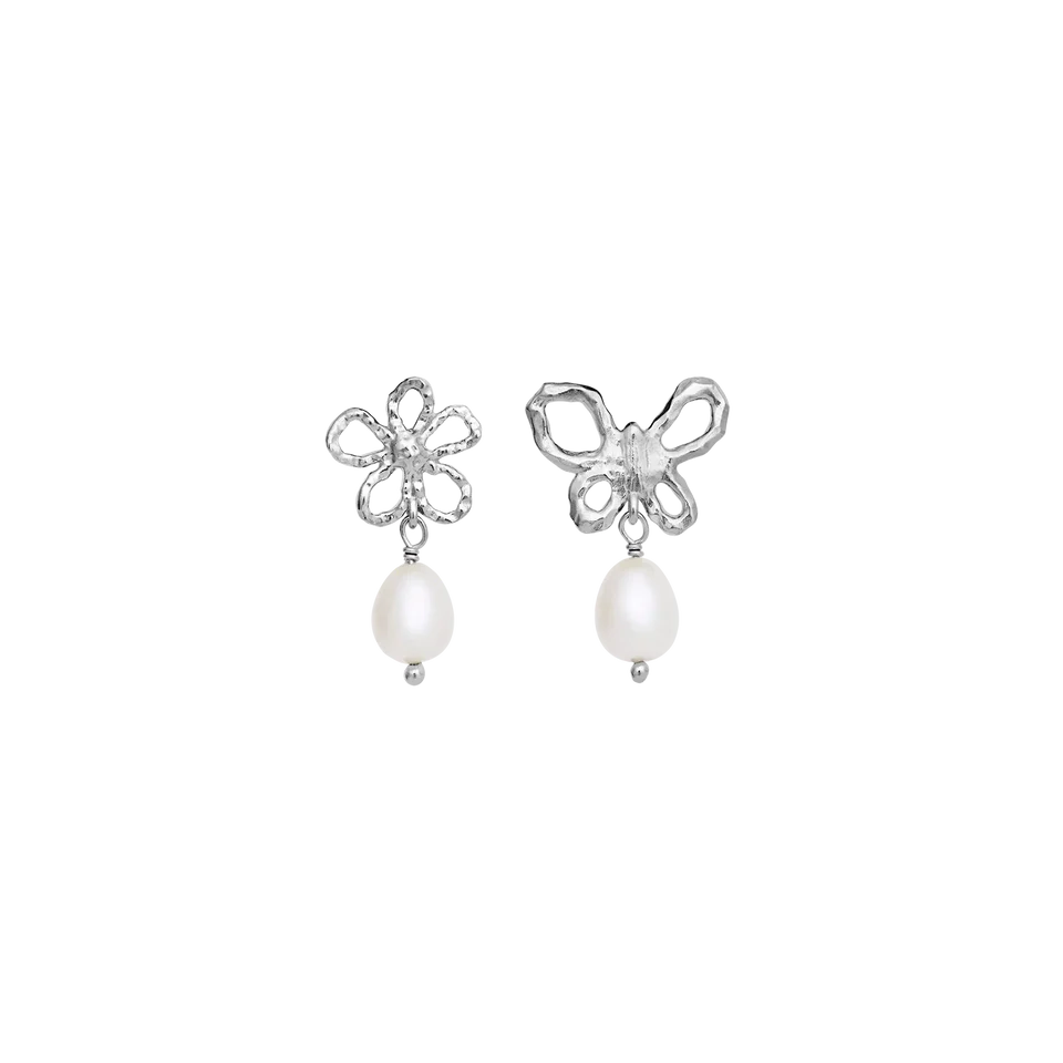 Søde øreringe formet som en lille blomst og sommerfugl, med en flot ferskvandsperle.