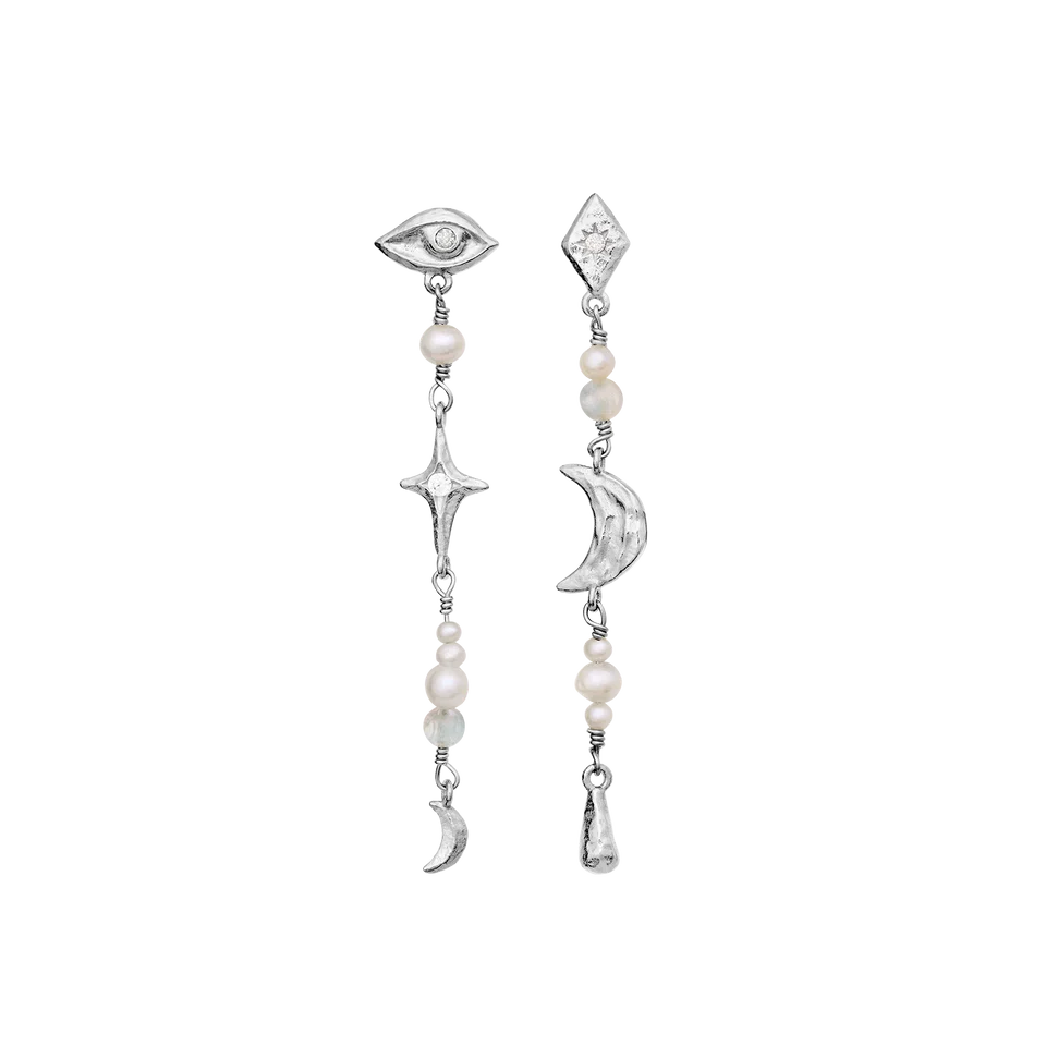 Maanesten Øreringe Rhodineret Sølv Asymmetriske med Ferskvandsperler, Zirkoner 10033C