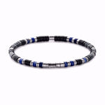 Et lækkert elastik armbånd med sorte agater, blå labradorit og flade stål elementer til mænd. Armbånd til mænd er blevet meget moderne. Her kan manden skabe opmærksomhed og designe sin egen stil. Et armbånd passer til hele garderoben, om det er til de slidte cowboybukser eller habitten. Kombinerer man forskellige styles kan man skabe et raffineret og råt look.