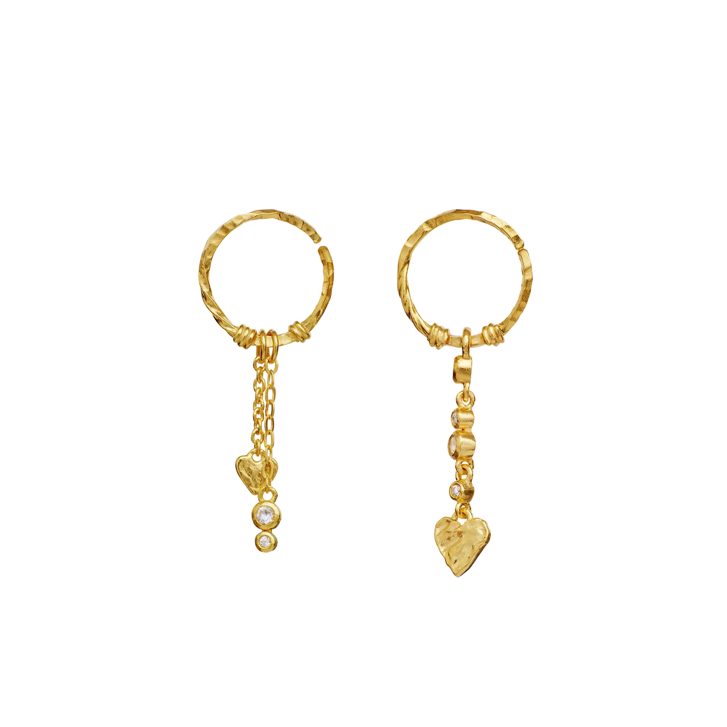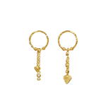 Søde creoler med hjerter, zirkoni og regnbue månesten hængende ned i kæder.